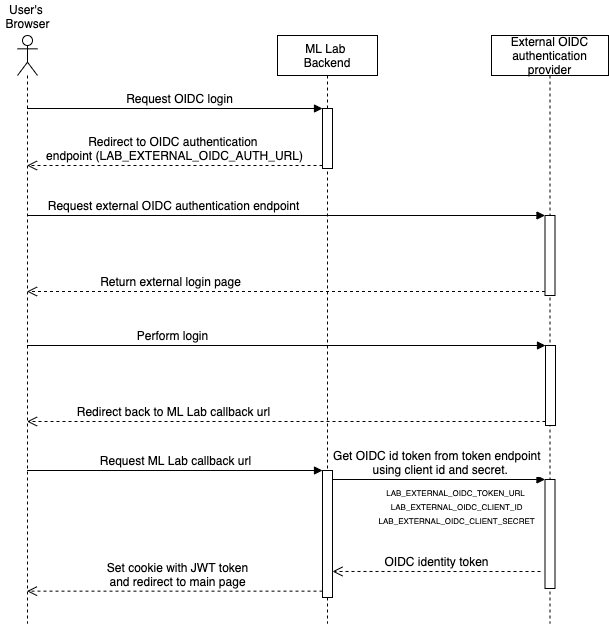 The sequence diagram above shows how ML Lab interacts with the external OIDC authentication provider.