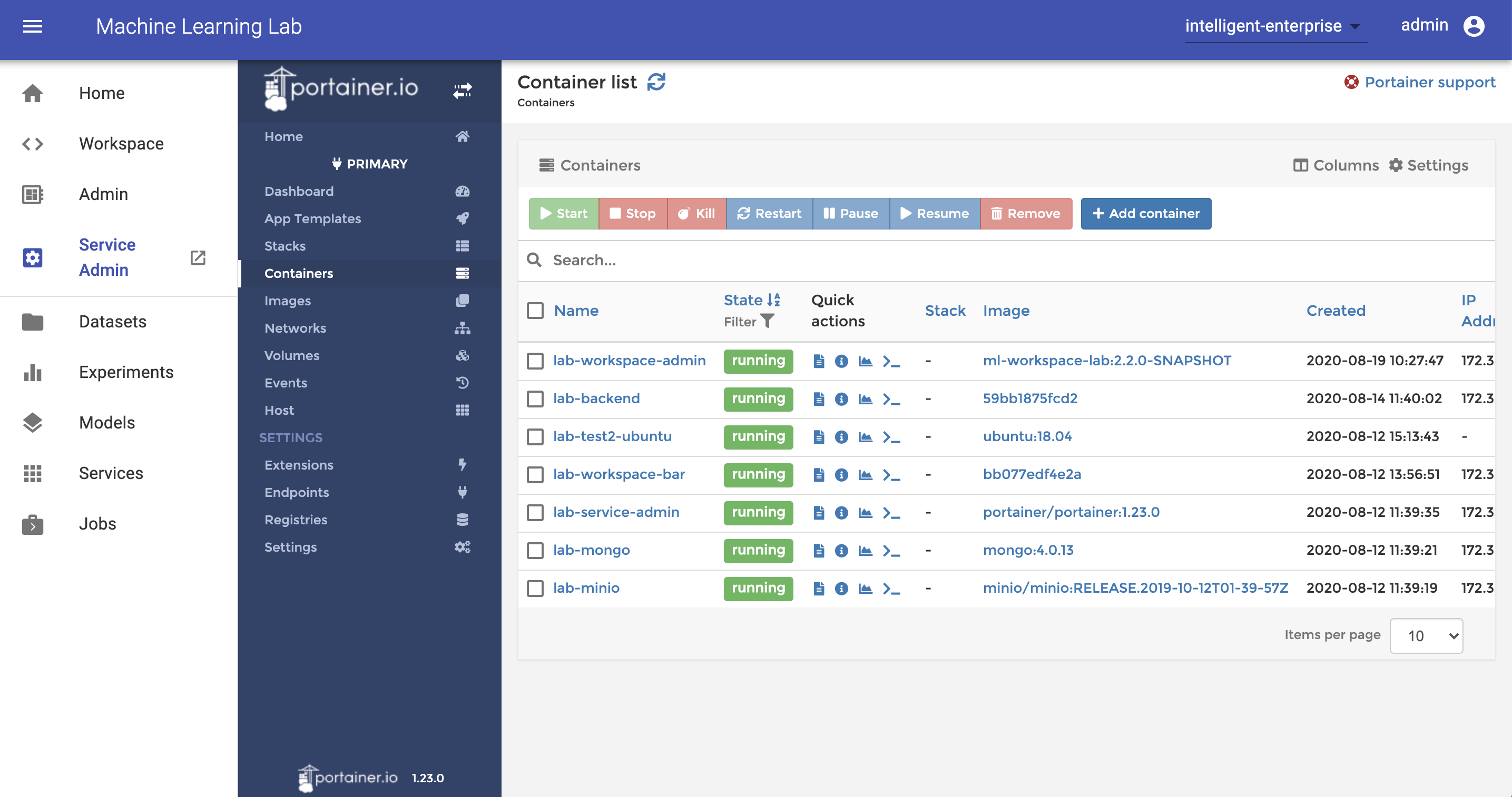 The service-admin section provides an administration dashboard (via Portainer in local or Swarm mode or Kubernetes Dashboard in Kubernetes mode) that can be used by an admin user to manage the Docker resources using a GUI without the need to use the command-line interface.