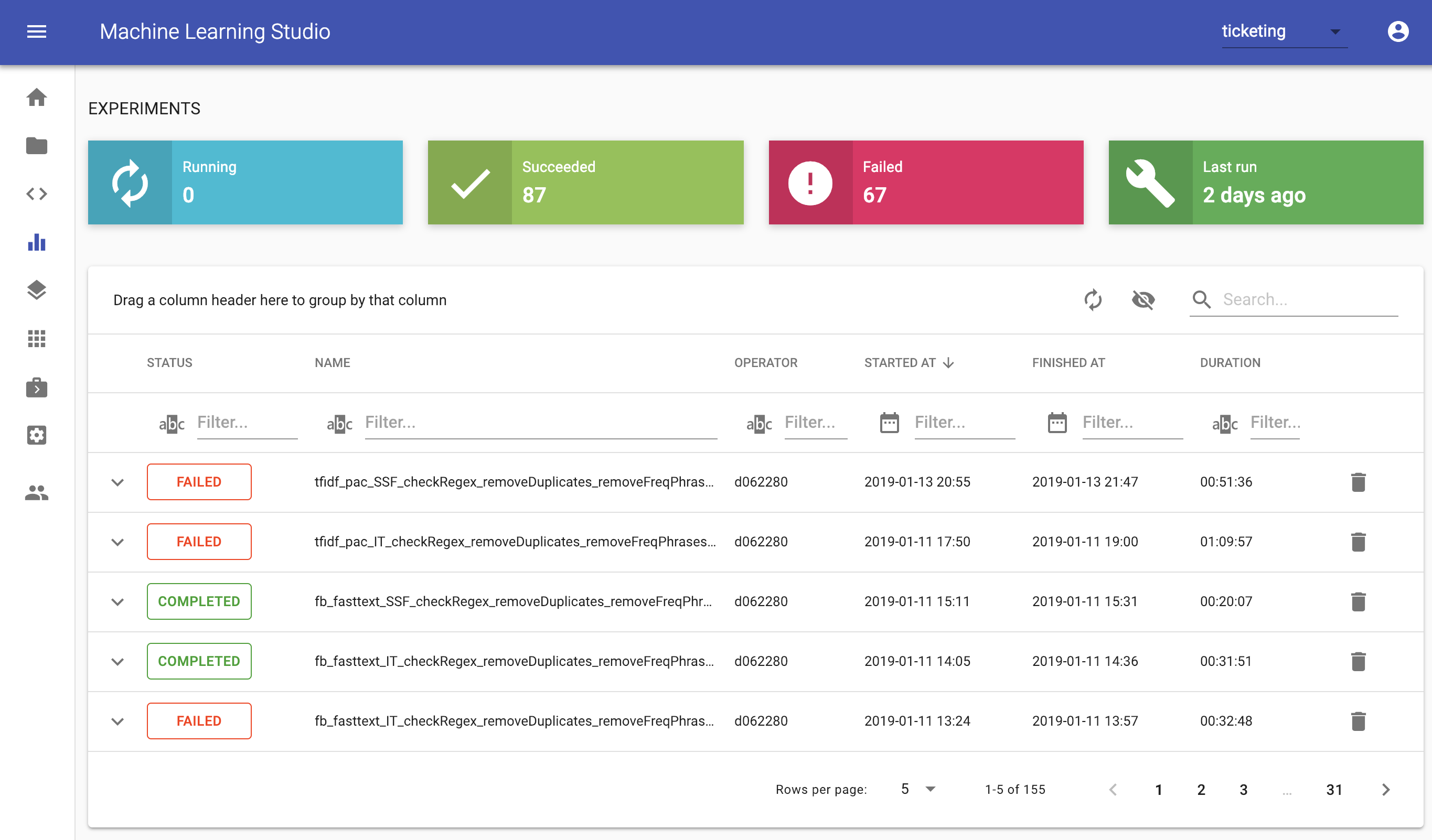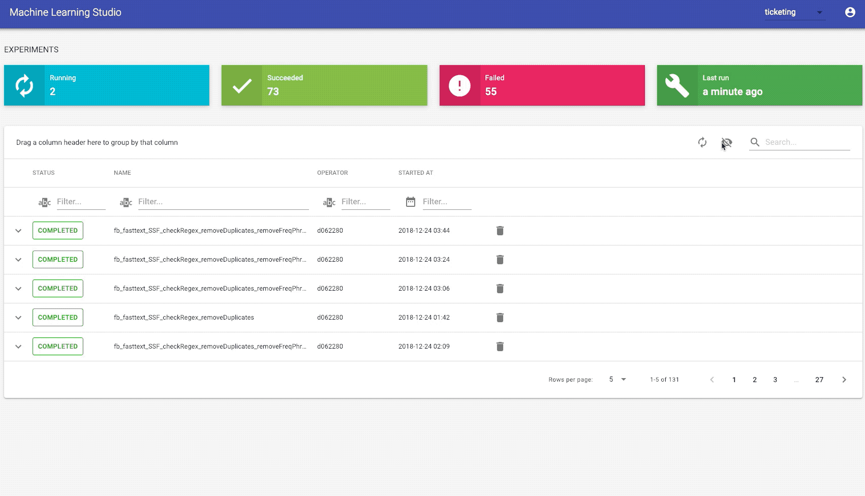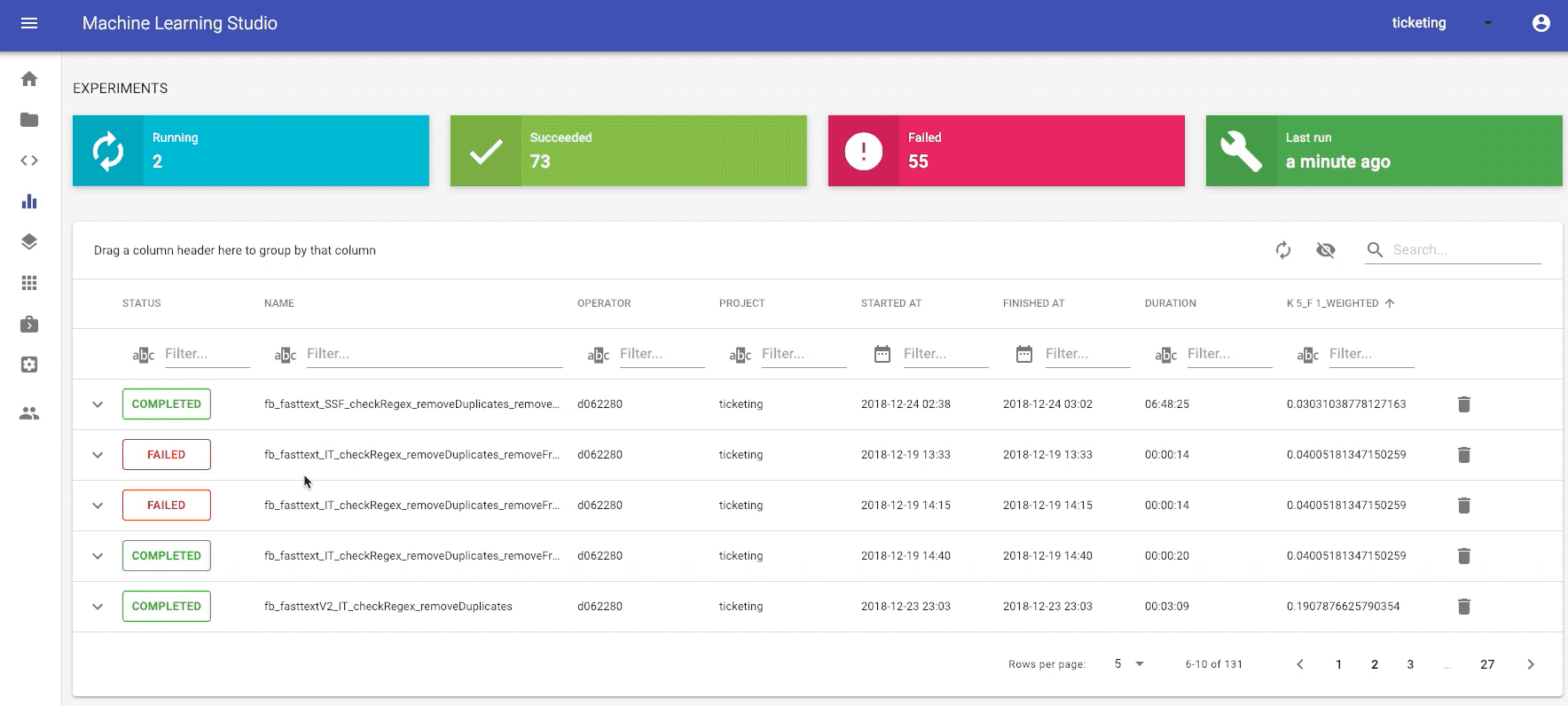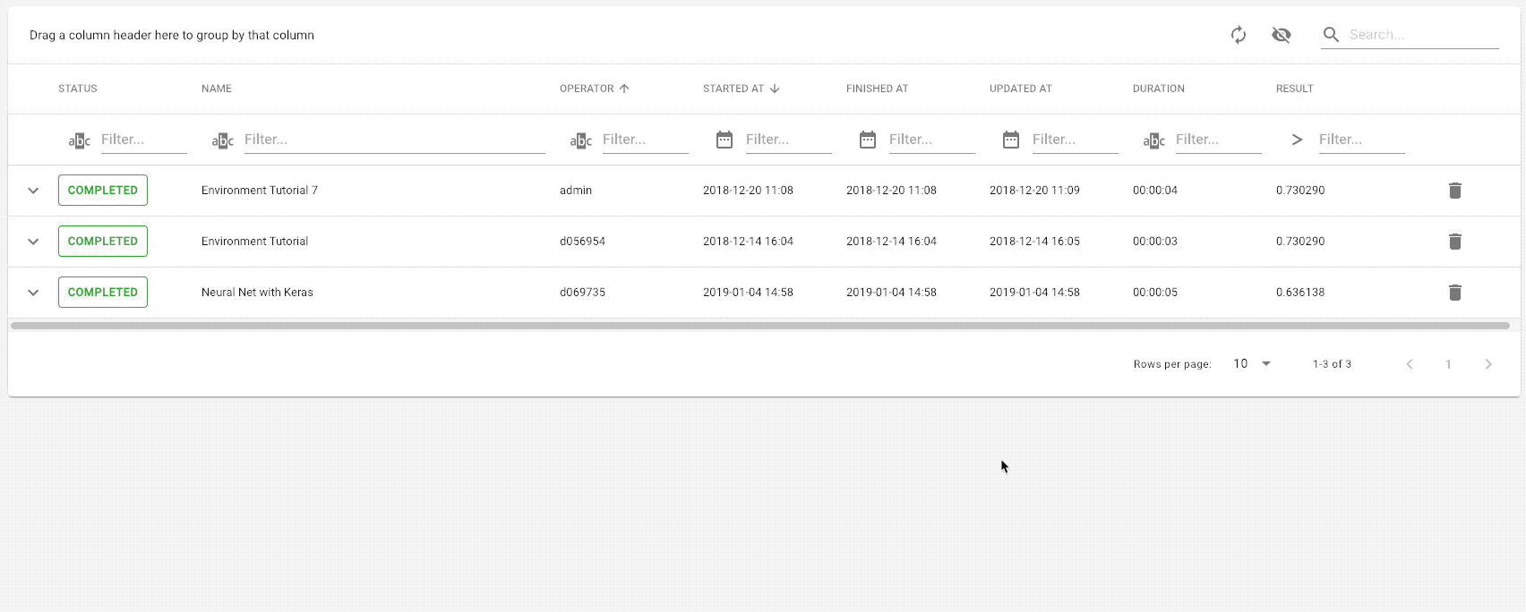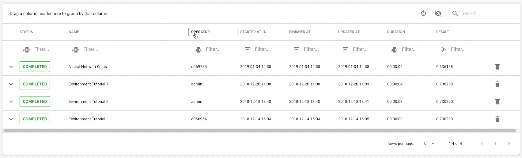 Sometimes things do not go as expected, e.g. the kernel died because of a memory leak or you had to interrupt the experiment. This might add up and lead to a bunch of useless entries and a messy history. You can delete experiments by clicking on the button at the very right end of the failed experiment.