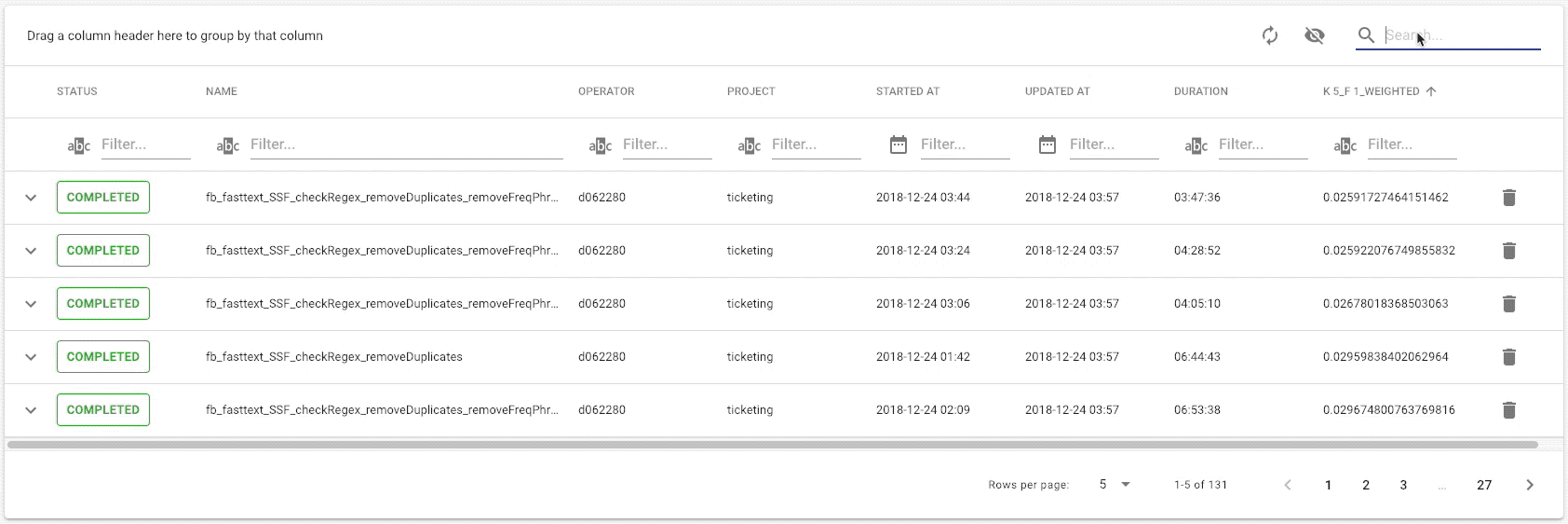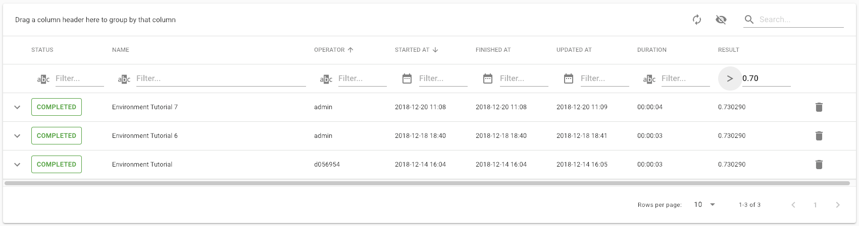 Another handy feature of the Experiment Dashboard is the grouping of attributes. You can easily group attributes, resulting in a tree view. This makes it easy to group experiments by operators of the project, status, or parameters. Additionally, it is possible to combine attributes leading to a nested tree view.