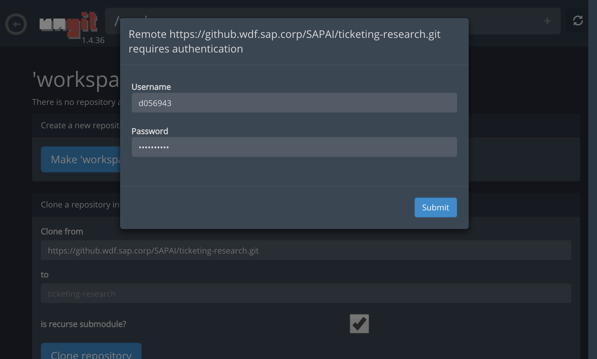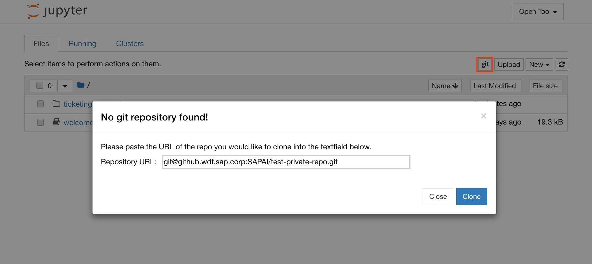 To clone a Git repository, you can either use https with authentication via credentials or ssh with authentication via public key. For cloning repositories via https, we recommend to use Ungit (Open Tool -> Ungit) as shown below. If authentication is required, you will get asked for your credentials.