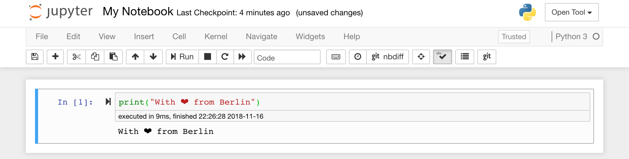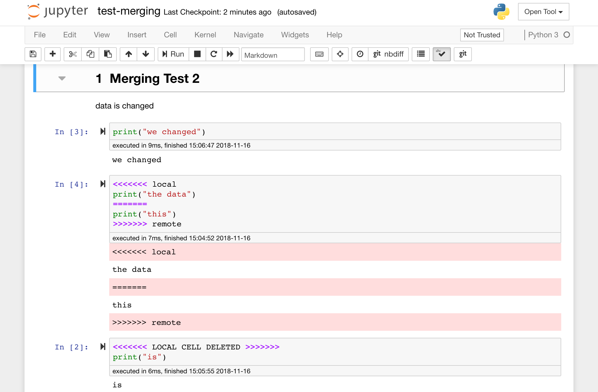 The workspace is pre-installed with nbdime, a tool for diffing and merging of Jupyter notebooks. Nbdime understands the structure of notebook documents and, therefore, can make intelligent decisions when diffing and merging notebooks. In the case you have merge conflicts, nbdime will make sure that the notebook is still readable by Jupyter.