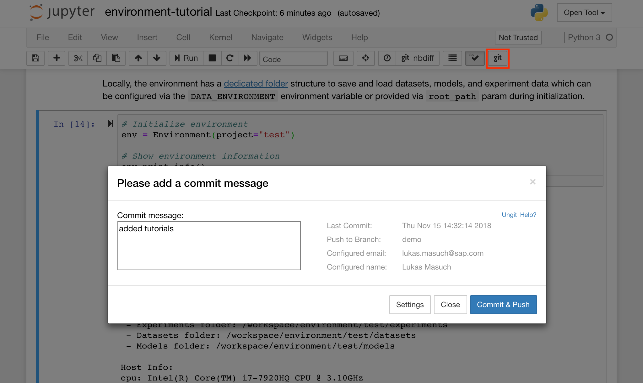 To commit and push a single notebook to the remote Git repository, we recommend to use the Git plugin integrated into Jupyter as shown below: