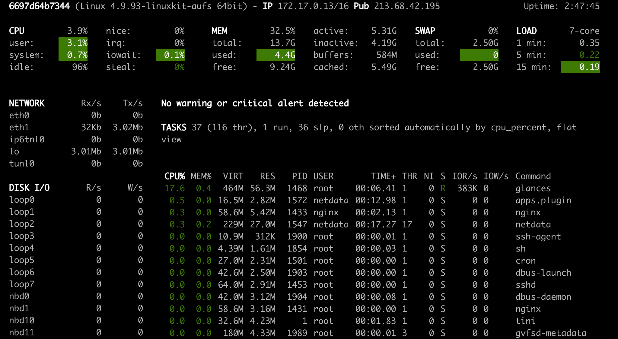 Netdata will show you the hardware statistics of the server on which the workspace container is running.