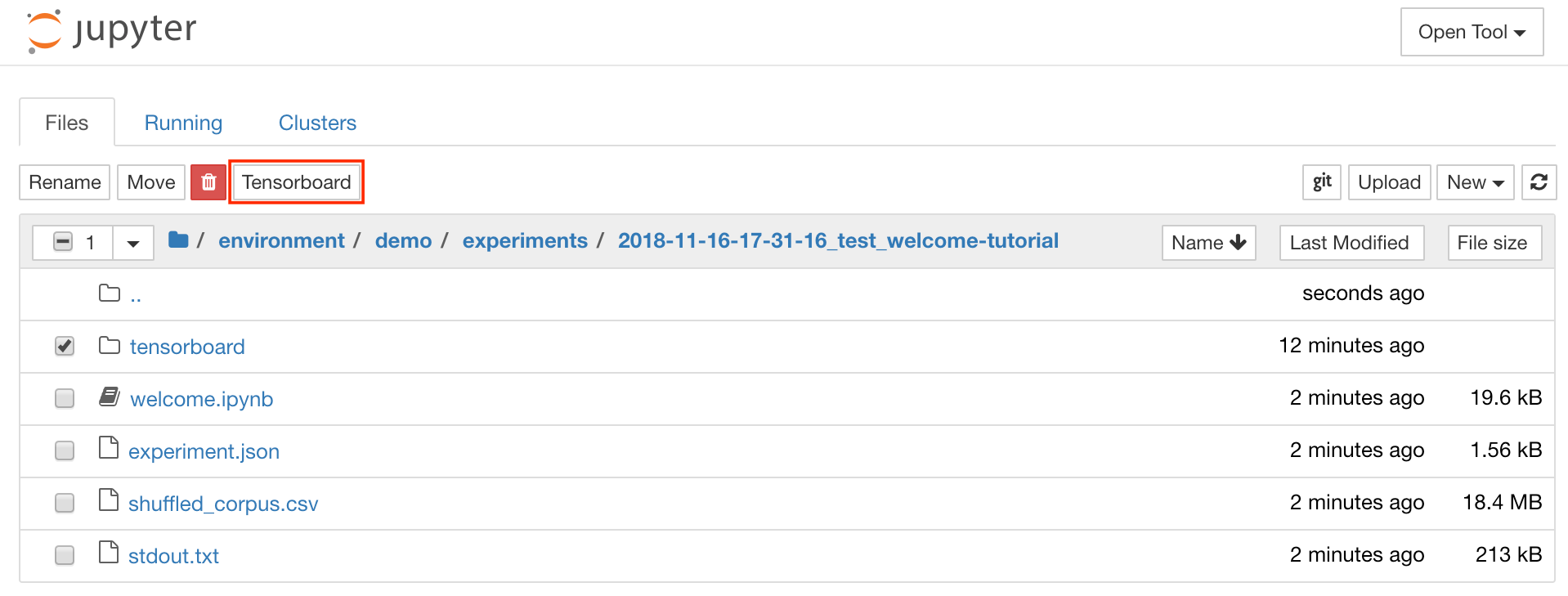 Tensorboard provides a suite of visualization tools to make it easier to understand, debug, and optimize you experiment runs. It includes logging features for scalar, histogram, model structure, embeddings, and text & image visualization. We have integrated Tensorboard into the Jupyter interface with functionalities to start, manage, and stop instances. You can open a new instance for a valid logs directory as shown below: