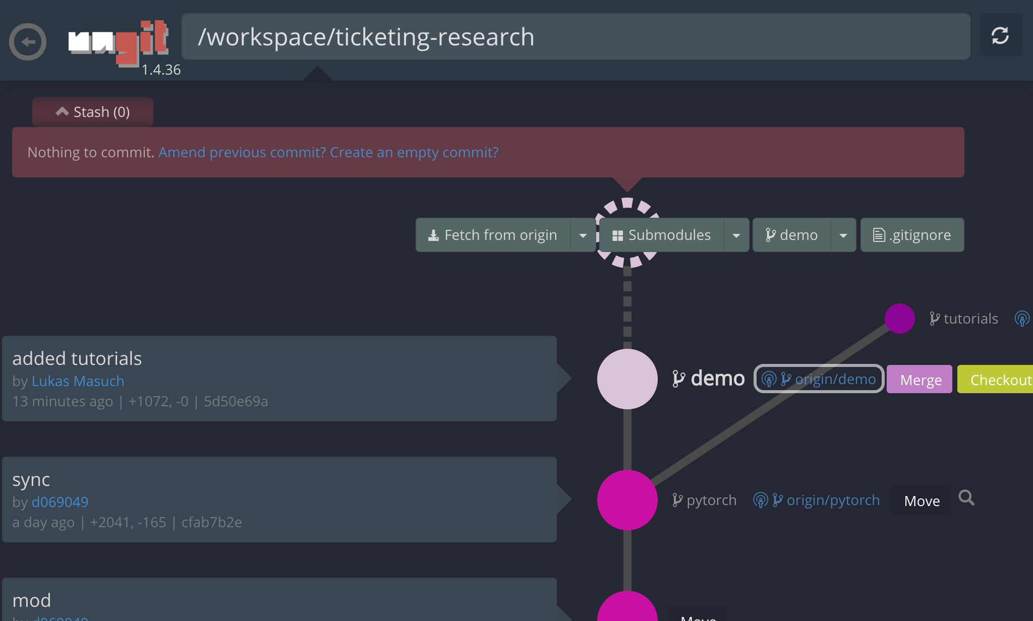 The other tool for more advanced Git integrations is ungit. It offers a clean and intuitive web-based UI that makes it convenient to sync your code artifacts. With ungit, you can do most of the common git actions such as push, pull, merge, branch, tag, checkout, and many more.
