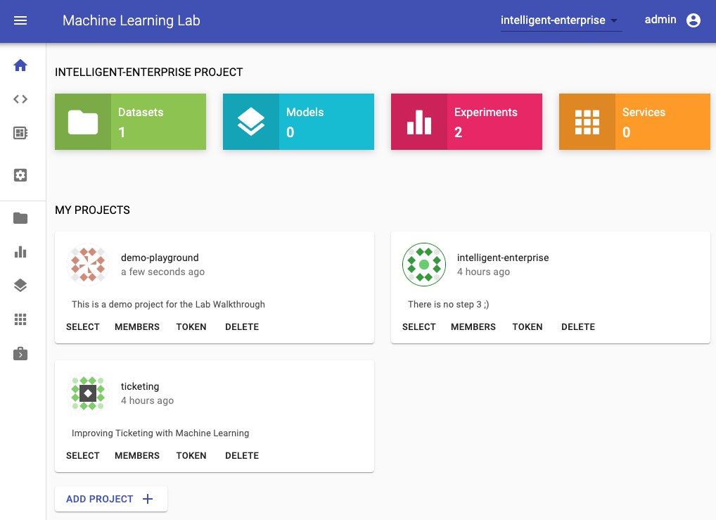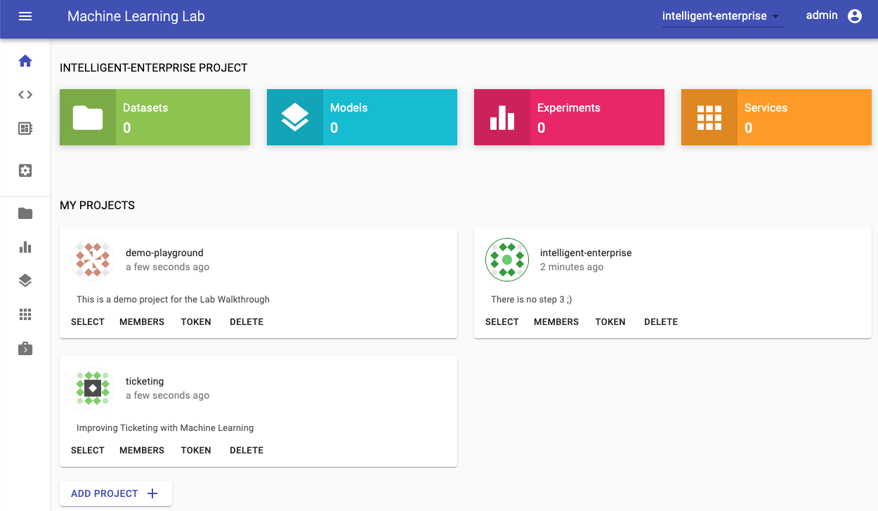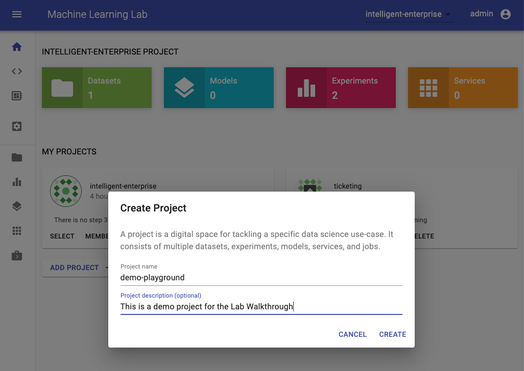 For this walkthrough, we will create a project which we will call demo-project. For your project you need to select a unique name that isn't already used by someone else on the ML Lab instance (e.g. <username>-project).