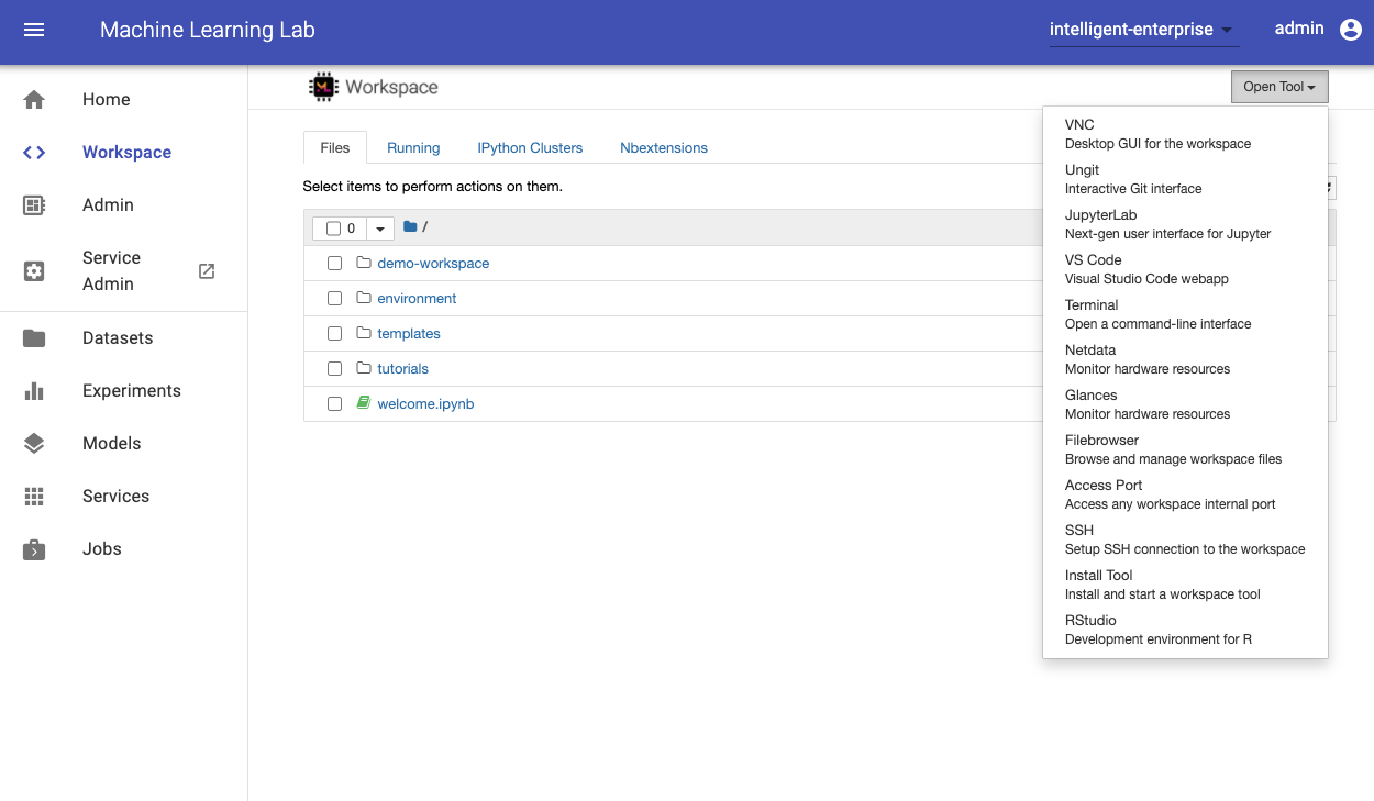 The workspace is equipped with a selection of common tools to help with the data science and experimentation workflow. Many of these tools can be started from the Open Tool menu. Within the workspace you can use our python client library to connect to ML Lab, as we will show below.
