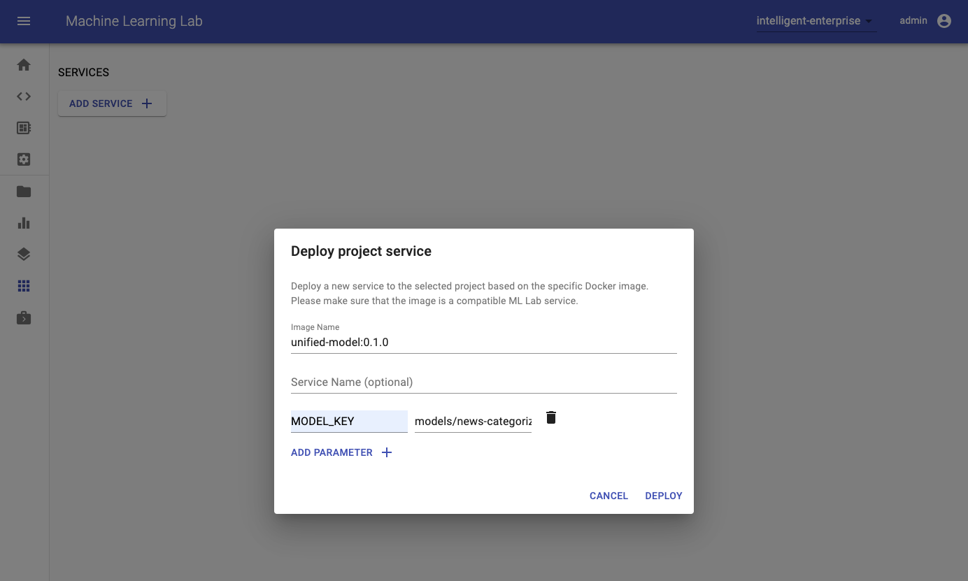 In order to deploy the uploaded model as a service into production, navigate to the Services page in the ML Lab. Click on the "Add Service" button and fill in the required fields. There are multiple possibilities how you provide the needed information. Either you create a Docker image that already contains the model or you create a generic image and provide information of how to download the model upon container start via an environment variable. For the latter one we recommend to use the ML Lab Python library in the image and just pass the model's name as an environment variable. ML Lab will inject other needed information such as project name, access token, and URL as environment variables automatically which are used by the Python library. One image that can be used for such a generic use-case is the Unified Model. You can copy the model's path in the Models section of the webapp.