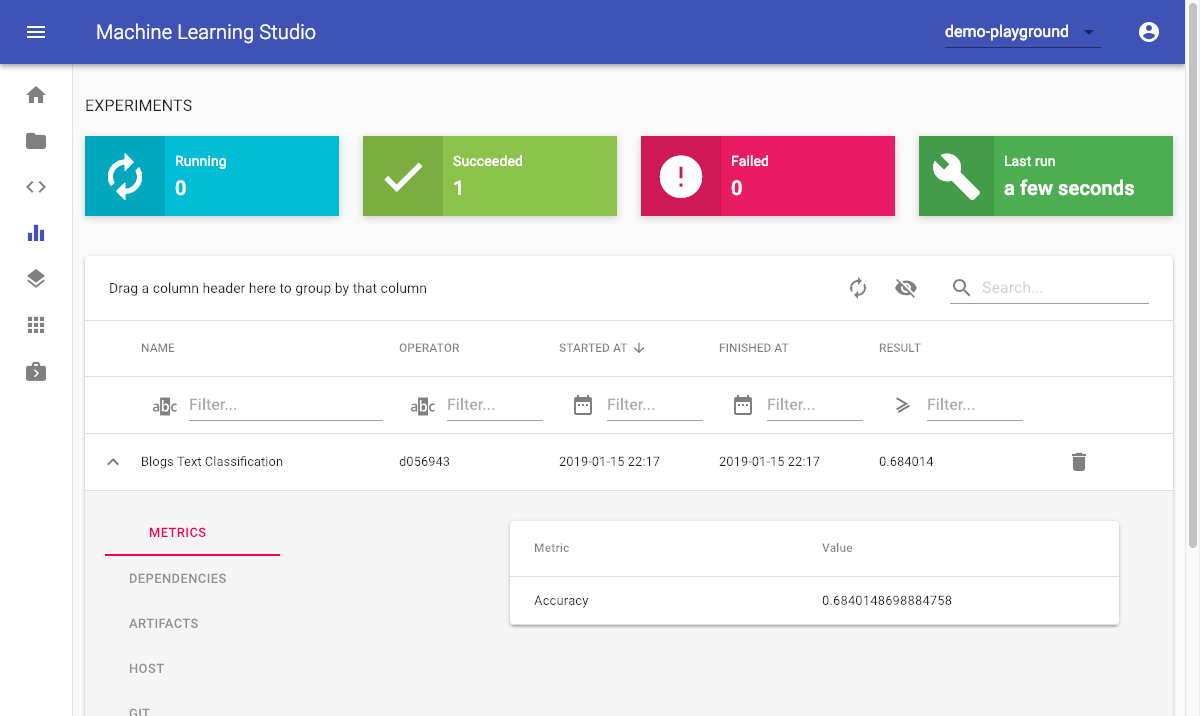 ML Lab also has integrated an experimentation dashboard for every project, that provides an overview for the team on all running and finished experiments with a lot of metadata to support reproducibility and transparency.