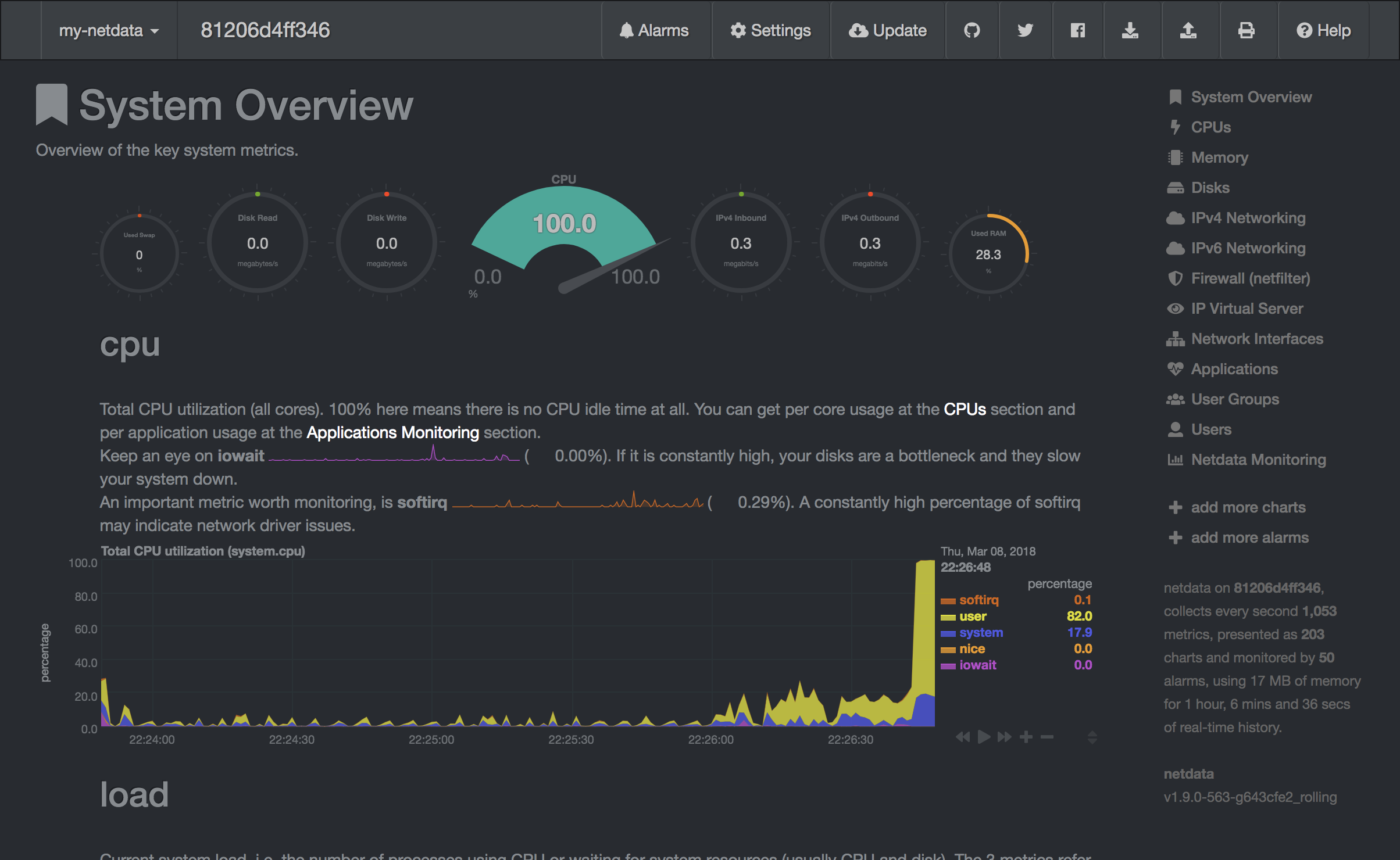 After the execution the training code, the experiment will require a short time for training. During this training, we offer some tools that helps us to monitor our experiment (accesible from the Open Tools selection). For example, you can use netdata during model training and other experimentation to get insights of everything happening on the system (CPU, GPU, memory, disks...) and figure out performance bottlenecks.