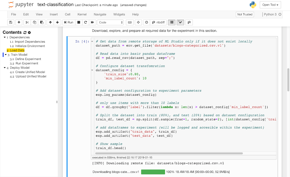 Once we have the unique key for the dataset, we can use the get_file method in our experiment notebook to download the file into our workspace: