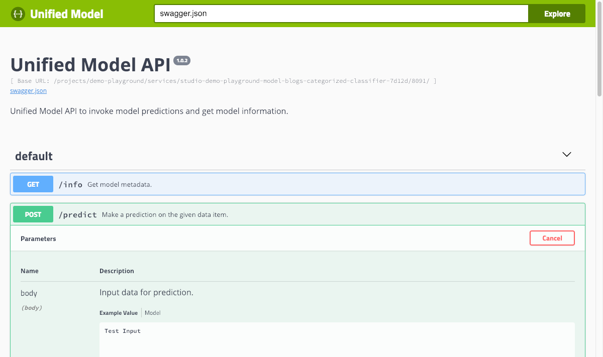 If the deployed image follows the ML Lab service specification, you can access the REST API documentation by clicking the access button on the created model service and try the predict method with any kind of input data.
