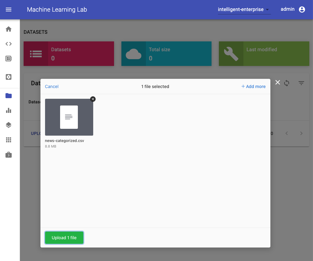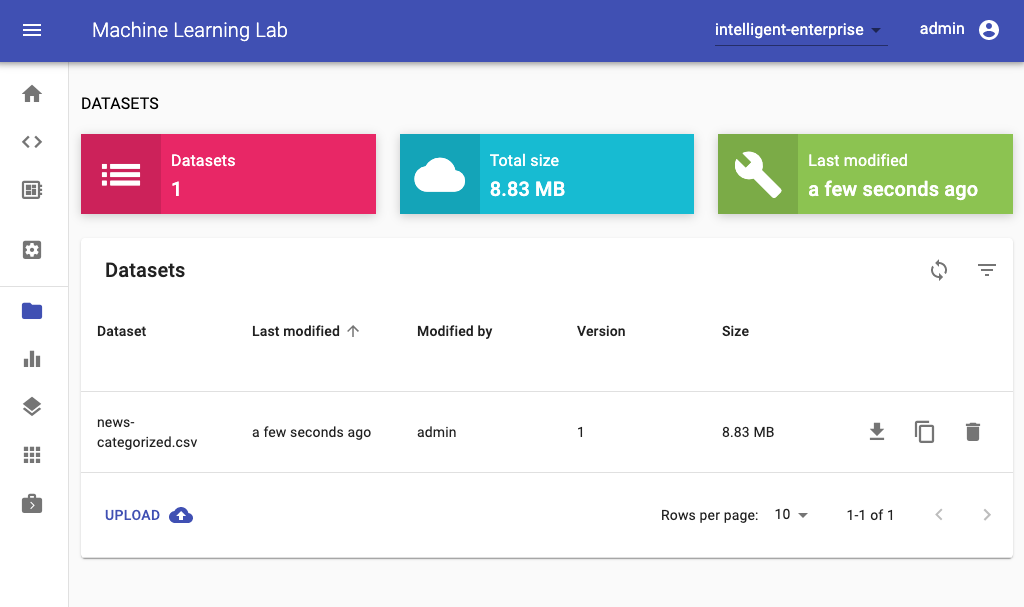 To start the experimentation process, we first need to upload a dataset. Therefore, we switch to the datasets section and select the upload functionality: