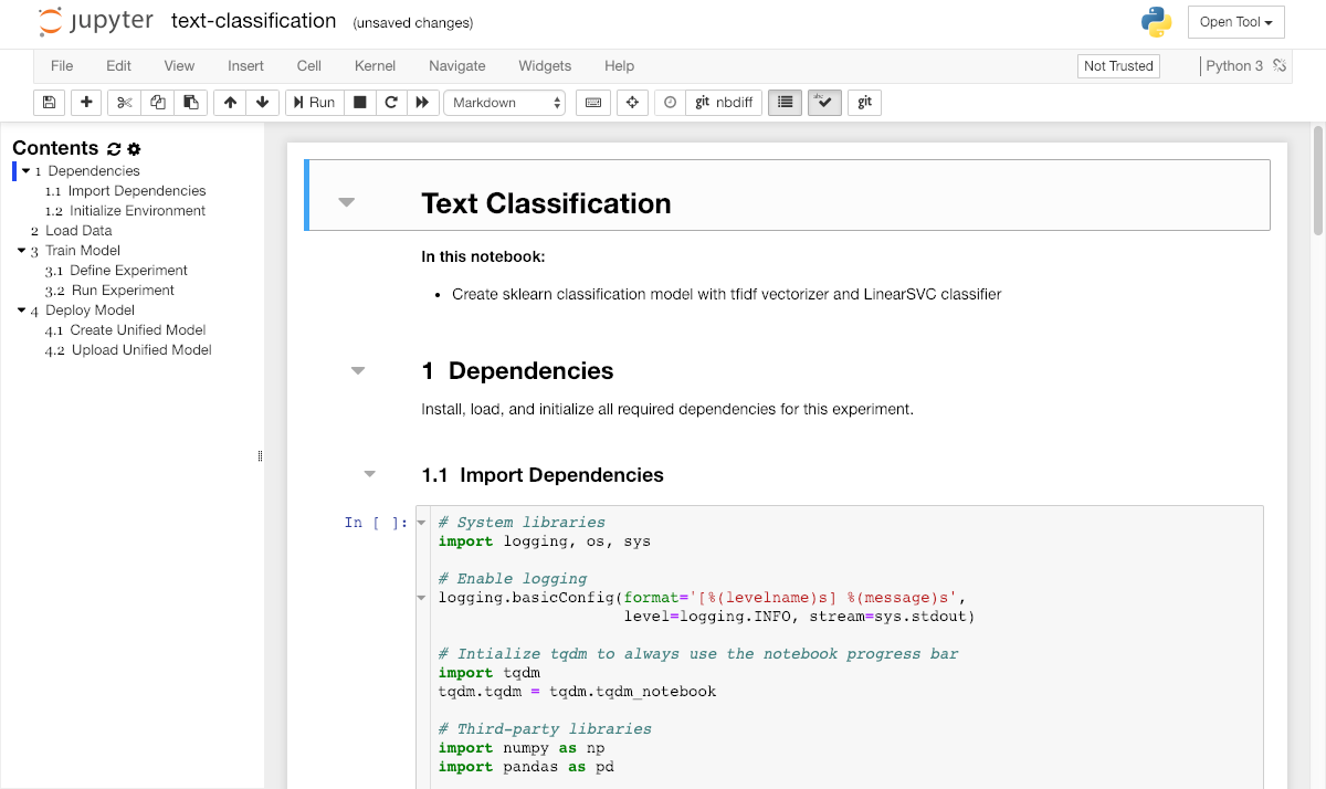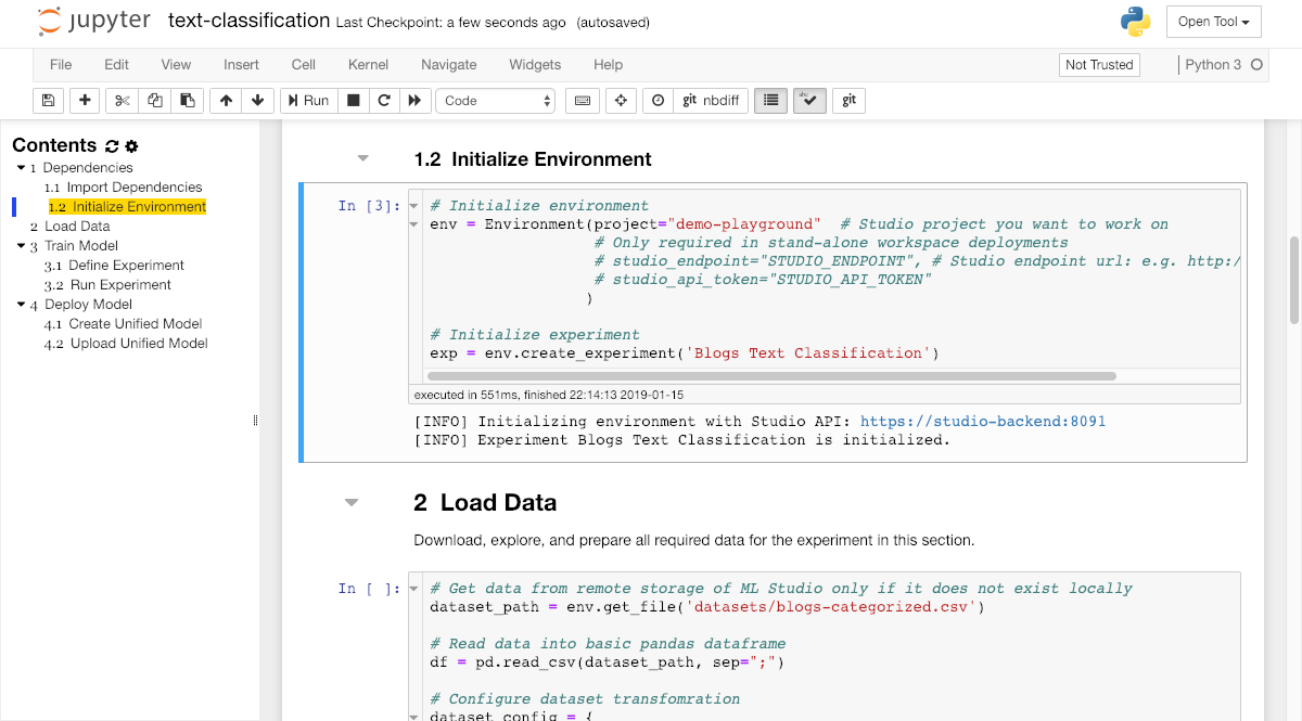 To get started with our experimentation, please open the text-classification.ipynb notebook inside the tutorials/ directory. Usually, we will have one notebook for every experiment. A notebook contains both computer code (e.g. python) and rich text elements (e.g. markdown).