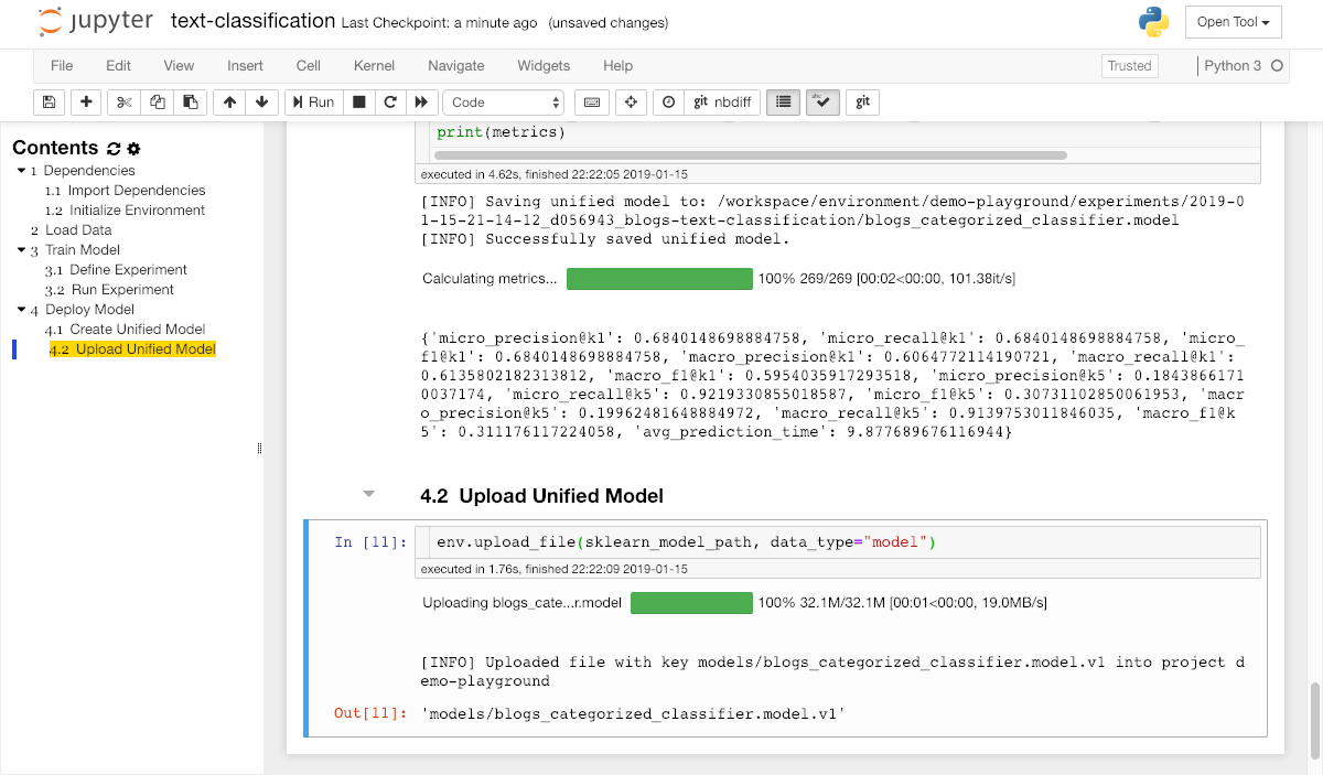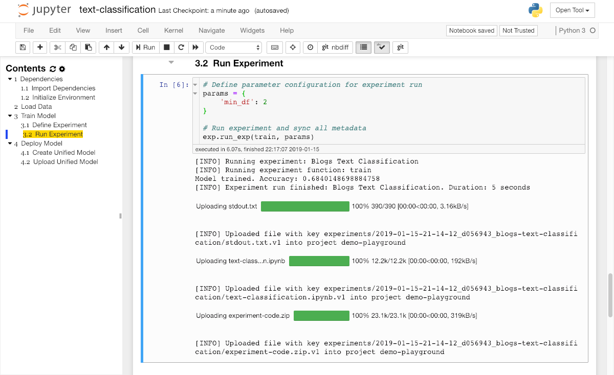 After a final evaluation of the model accuracy, we want to make the trained model available for deployment so that it can be used from any application. Therefore, we need to upload the trained model artifact into the model storage of our ML Lab project from within the classification notebook via the upload_file method: