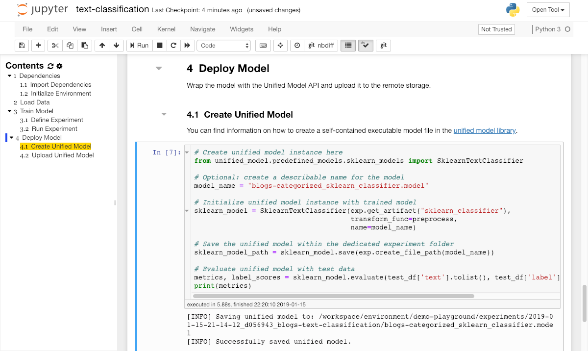 Once the training is finished, we will get a trained model instance as result which we can now use to predict an output for any given input. This model needs to be deployed as a service in order to offer the model's prediction capabilities for integration into applications. In order to easily share and deploy the trained model, we will use the unified model library to create a self-contained executable model file.